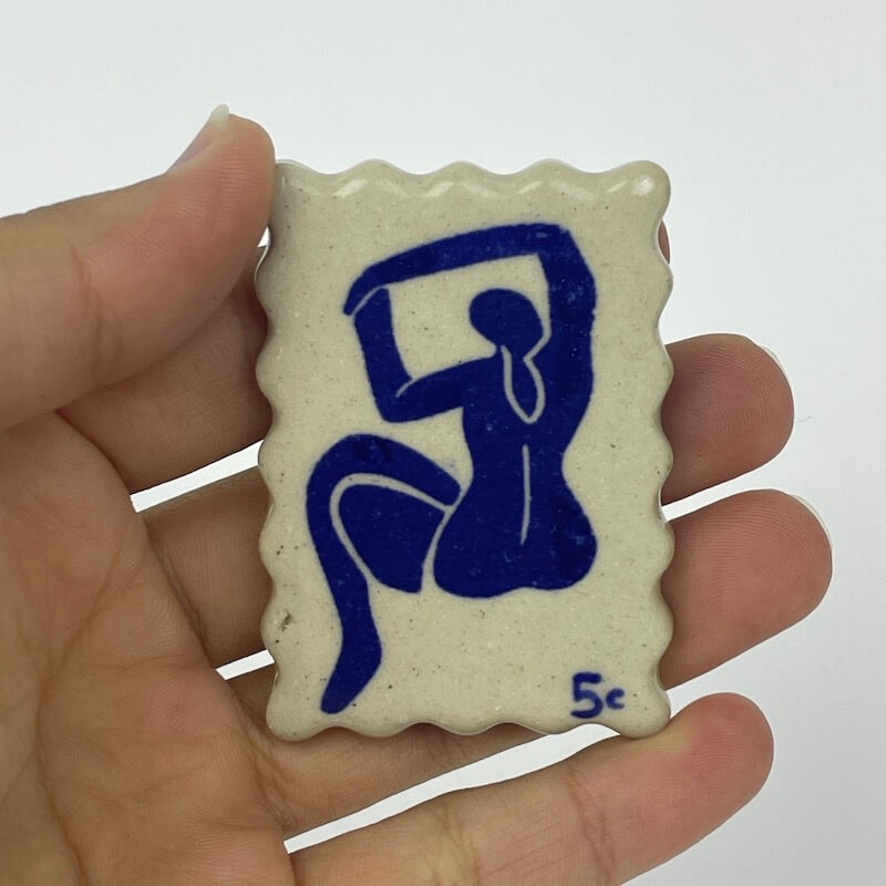 Handmade ceramic postage stamp with magnet attached.