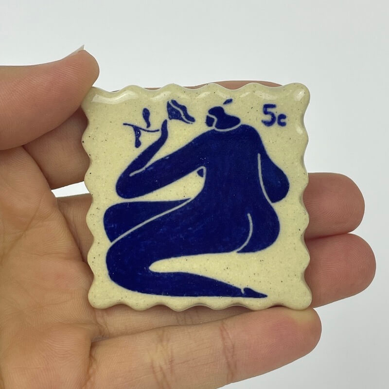 Handmade ceramic postage stamp with magnet attached.