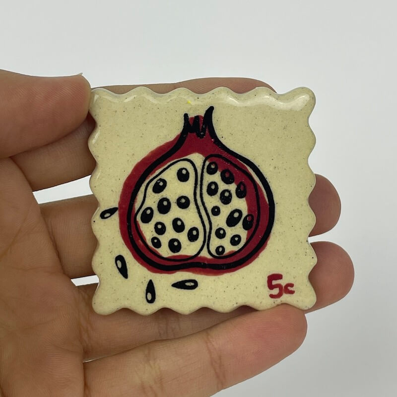 Handmade ceramic postage stamp with magnet attached.
