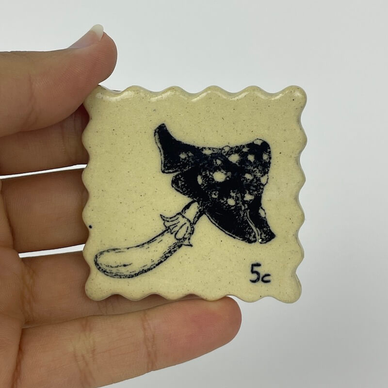 Handmade ceramic postage stamp with magnet attached.