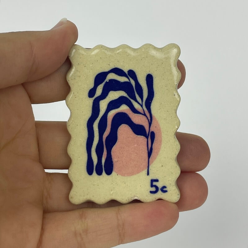 Handmade ceramic postage stamp with magnet attached.